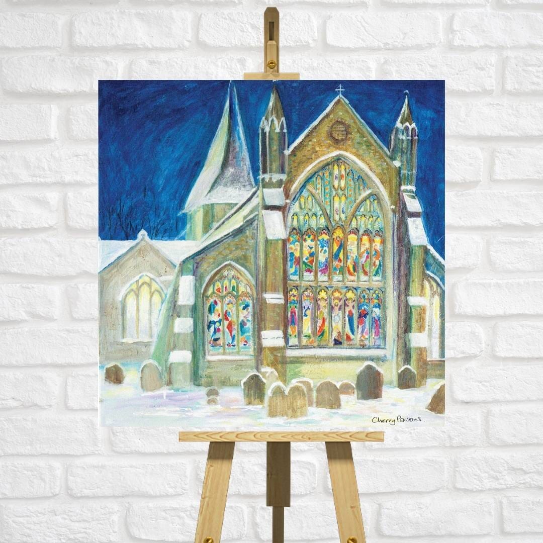 This rural landscape print is a snow scene of people enjoying a local sledging spot in Horsham.